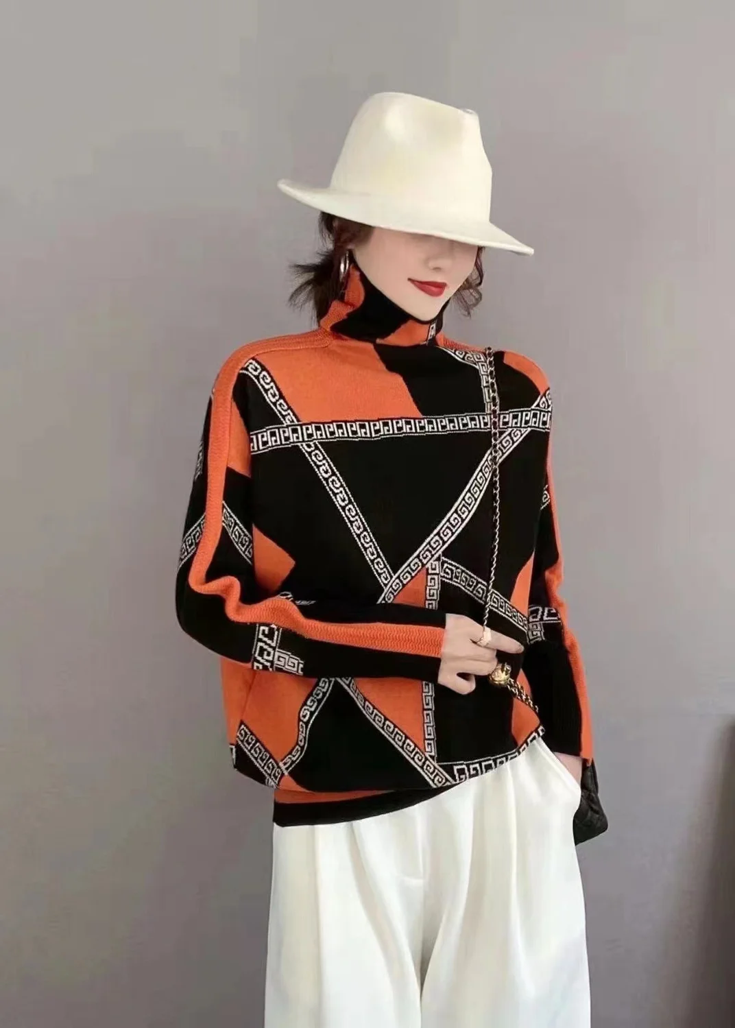 - Feminint & Elegant Design: Det fantastiske geometriske print sammen med den klassiske turtleneck tilføjer et raffineret elegance til ethvert outfit. Du vil skille dig ud i mængden, samtidig med at du føler dig helt komfortabel.
