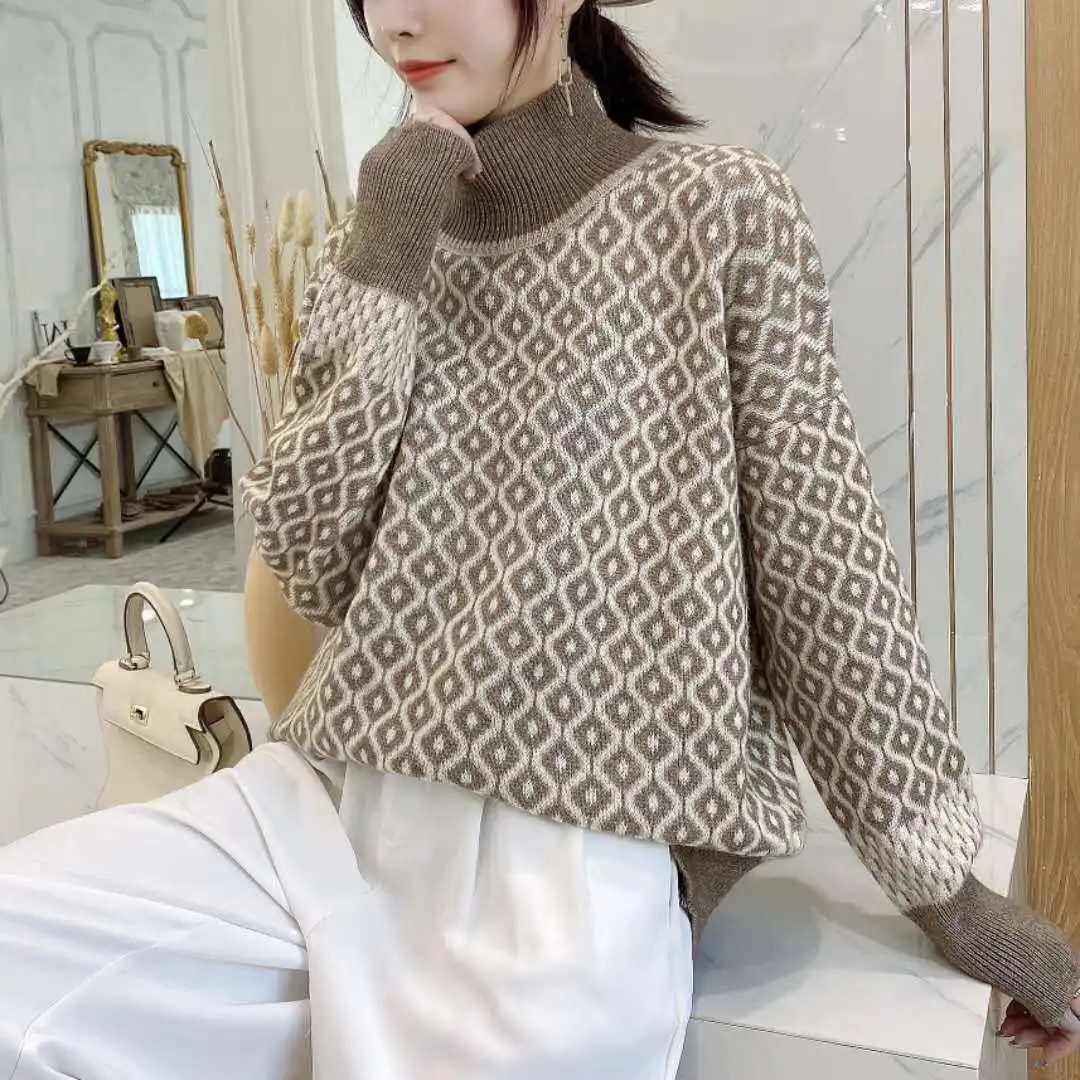Jette | Kvinders Elegante Strikkede Sweater med Høj Hals og Ternet Mønster